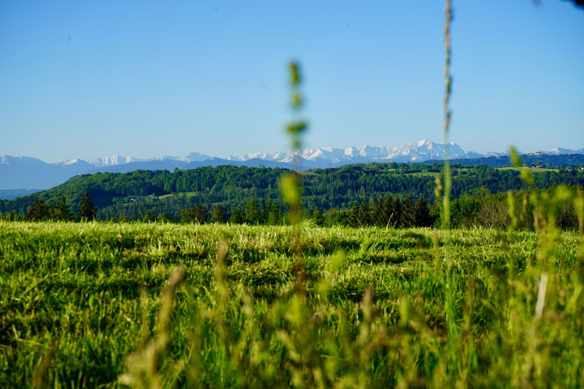 Vom Balkon können Sie bei entsprechendem Wetter etwas die Berge sehen. Kurz hinterm Haus beeindruckt das volle Bergpanorama.