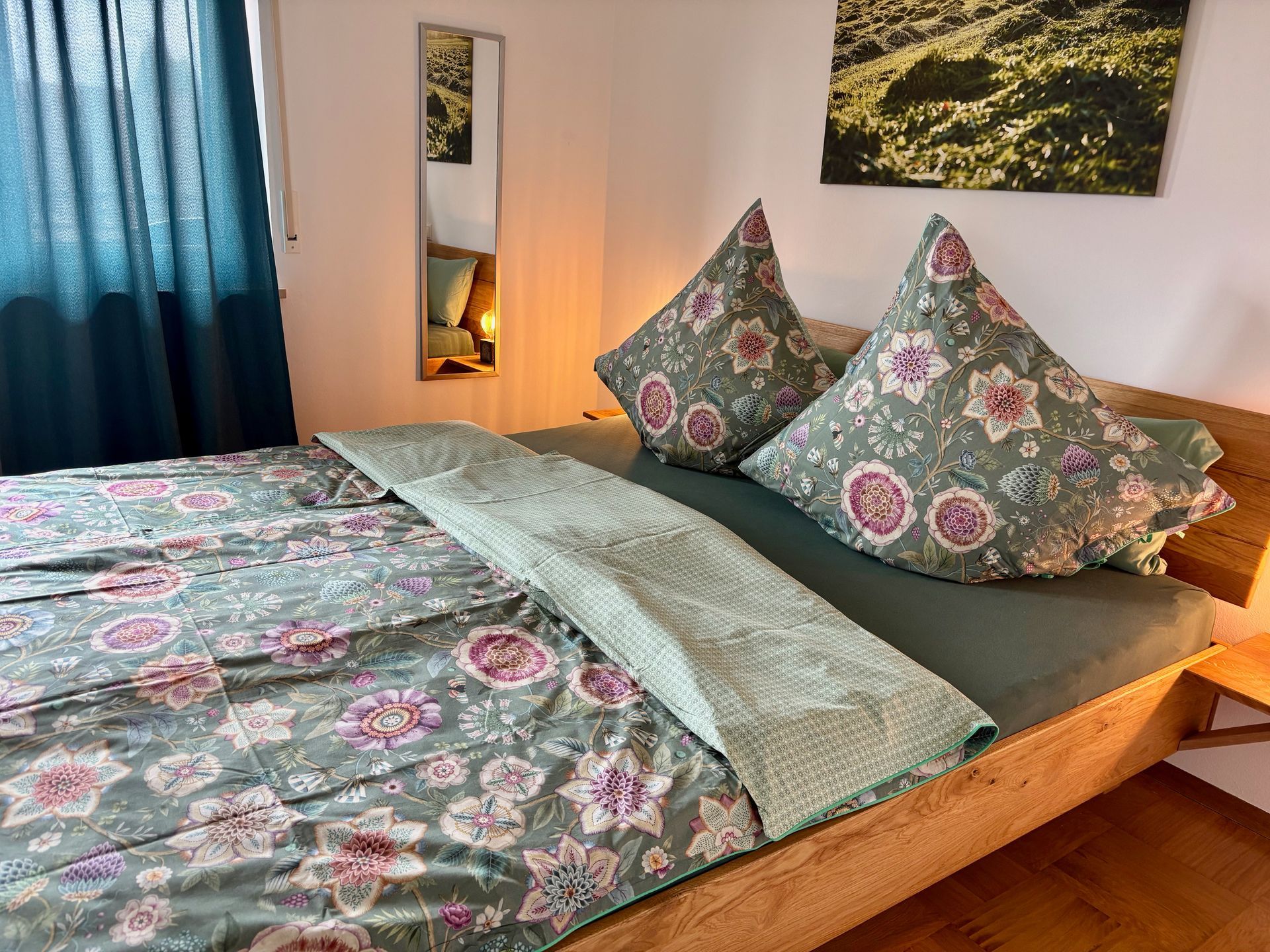 Das Schlafzimmer verfügt über ein Doppelbett und einen großen Kleiderschrank.